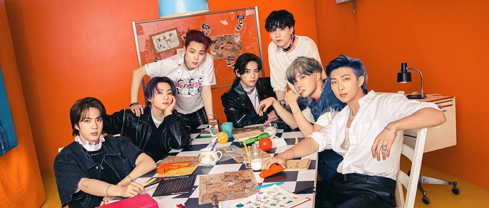 Integrantes: RM, Jimin, Suga, J-Hope, Jungkook, V e Jin.