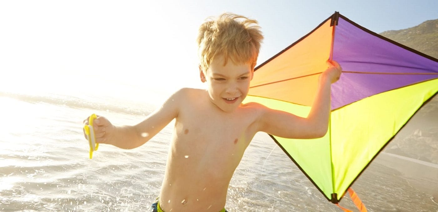criando correndo na praia com uma pipa na mão, representando o conceito de como soltar pipa